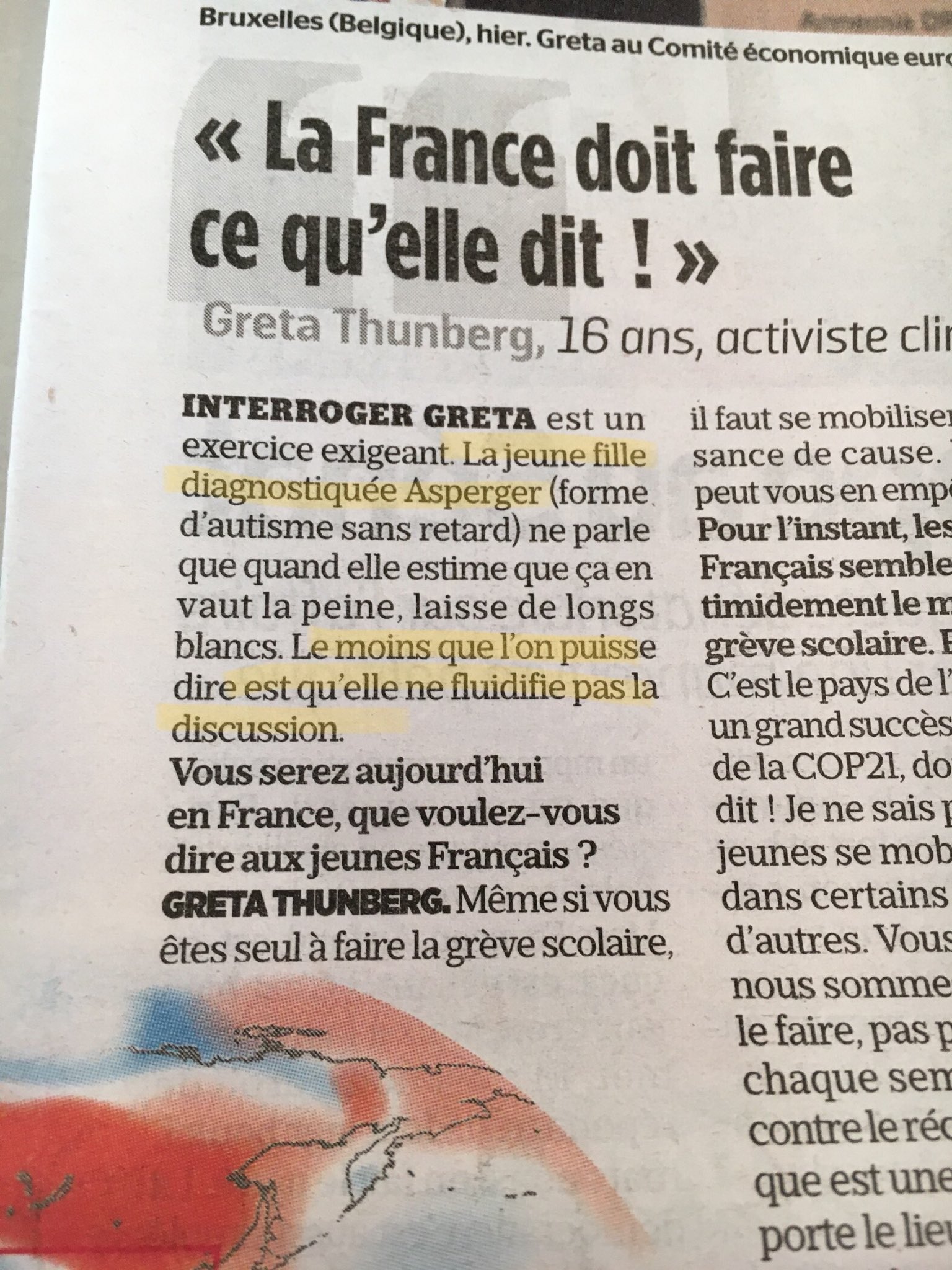 Interroger Greta est un exercice exigeant. La jeune fille diagnostiquée Asperger (forme d’autisme sans retard) ne parle que quand elle estime que ça en vaut la peine. Timide, elle est pourtant devenue une icône et le porte-voix de toute une génération qui veut sauver la planète depuis le discours qu’elle a prononcé à la COP24, en décembre dernier. ». Bien que l’article en ligne soit corrigé, celui du papier ne peut pas l’être et l’ensemble des lecteurs lira ce passage immoral. Pour le moment, aucune excuse de la rédaction du Parisien, et il serait honnête pour réparer cette faute que l’auteure de l’article, Emilie Torgemen, présente des excuses publiques et soit condamnée moralement par la rédaction.