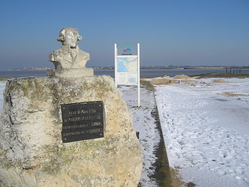 1 – Bien que la date d’arrivée à Boston le 27 avril 1780 soit admise, on trouve plusieurs dates et lieux quant à celle de l’appareillage de La Fayette, dont celle du 21 mars 1780, ou d’un départ depuis l’île d’Aix. La date reprise ici, le 10 mars 1780, est issue du site de l’association Hermione – La Fayette, et le lieu d’appareillage du marquis repris est celui du Pont-des-Barques dans lequel on retrouve cette anecdote sur le site de Rochefort-Océan et où se trouve une stèle à son effigie au bord de la jetée, indiquant par ailleurs la date du 10 mars 1780.