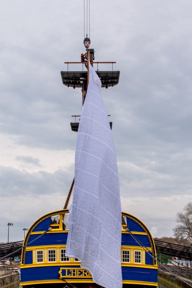 À l’étonnement de l’association Hermione – La Fayette, les aides, les financements et les mécènes furent rares. Inattendue et préoccupant puisque même si de nombreux bénévoles participaient à l’opération, il fallait bien financer dans son ensemble le chantier et les professionnels qui y travaillaient. L’aide de la municipalité rochefortaise, du département Charente-Maritime et de la région Poitou-Charentes ne suffisaient pas, et l’État était inexistant jusqu’à la présidence Sarkozy et le don de 200 000 € une fois la frégate bien avancée. Il avait fallu déjà quatre ans, de 1992 (année de la création de l’association) à 1996-97 pour trouver des fonds, parallèlement aux recherches et à la conception des premiers plans. Les premiers pas sont les plus durs puisqu’un projet aussi audacieux et conséquent à peine débuté a moins tendance à attirer des mécènes qu’un navire bientôt sur l’eau. Comment l’association Hermione – La Fayette a réussi à aller jusqu’au bout de son projet sans avoir de conséquents arrêts de chantier ? Le coût final et total du projet de la réplique de l’Hermione fut selon l’association de 40 millions d’euros, dont 25 millions pour la construction. En premier lieu, l’association a connu de nombreux adhérents. En 2015, leur nombre était de 7000, une adhésion valant 25€ minimum par an (30€/an pour les adultes en 2019). Adhérer à l’association permet à chacun d’être propriétaire de la frégate et 1000 d’entre eux assistent à l’assemblée générale annuelle qui présente le bilan de l’année écoulée et les orientations de l’année à venir. Ainsi, l’Hermione est devenue un bien commun et cette méthode permet l’entière indépendance de la frégate. Selon Maryse Vital, déléguée générale de l’association Hermione – La Fayette de 1997 à 2017, l’Hermione est un « projet populaire », clé de sa réussite. Mais pour subvenir à ses besoins, l’adhésion ne suffit pas. L’association a dû trouvé d’autres stratégies pour combler le manque de moyen, comme la création de la Fondation Hermione sous l’égide de la Fondation du patrimoine qui permet à chaque donateur de bénéficier d’avantages fiscaux. Pour attirer des dons, il faut que le projet soit connu, donc médiatisé. L’opportunité s’est produite en 1999 lorsque l’émission Thalassa s’est intéressée au chantier1. Un événement médiatique qui a popularisé le projet à l’échelle nationale : « L’émission nous a offert une notoriété nationale. C’était bienvenu car nous n’avons jamais consacré beaucoup d’argent à la communication. Au début on peinait un peu pour faire venir des journalistes… » (Maryse Vital). Autre stratégie populaire et qui a bien fonctionné, c’est la mise en place de l’opération « Votre nom pour l’Hermione ». En échange d’un don de 10€, le donateur voyait son nom inscrit sur le grand pavillon. Aujourd’hui, ce pavillon est plus noir que blanc.