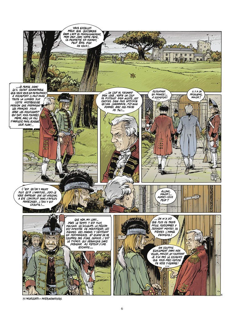 Alors que la France prépare ses plans pour le général La Fayette et sa mission aux Amériques, l’Angleterre envoie un espion à la Rochelle pour savoir ce que son ennemi traditionnel trame avec les indépendantistes. Plus qu’une affaire de bateau, cette bande-dessinée est une affaire d’espionnage dans le très intéressant triangle français-anglais-indépendantistes. En effet, la France est sortie affaiblie de la guerre de Sept Ans (1756-1763) et cherche à prendre sa revanche face à l’Angleterre qui s’en est sortie renforcée. C’est ainsi pour cette raison que la France prend la décision de soutenir les indépendantistes américains – les treize colonies – face à la Grande-Bretagne lors de la Guerre d’indépendance des États-Unis (1775-1783). J’en parle parce que ce contexte est l’atout de la BD, j’aime beaucoup les relations France-Angleterre et cette période de l’histoire que j’ai étudiée en licence. De plus, je suis dans une période où j’adore suivre les histoires maritimes et le personnage de La Fayette me passionne. Un tas d’éléments enchevêtrés qui m’a fait aimer la BD puisque le scénario puise dedans et reste une affaire d’espionnage jusqu’à la fin.