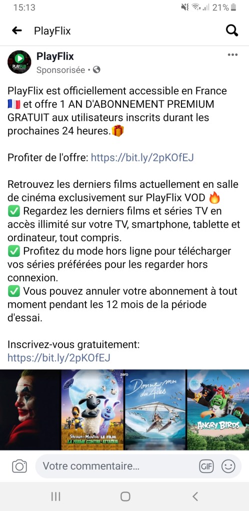 ur Facebook, vous pouvez trouver une offre alléchante : un abonnement de 12 mois d’essai sur la plateforme Playflix (cc Netflix) qui permet de visionner tous les films actuellement en salle.