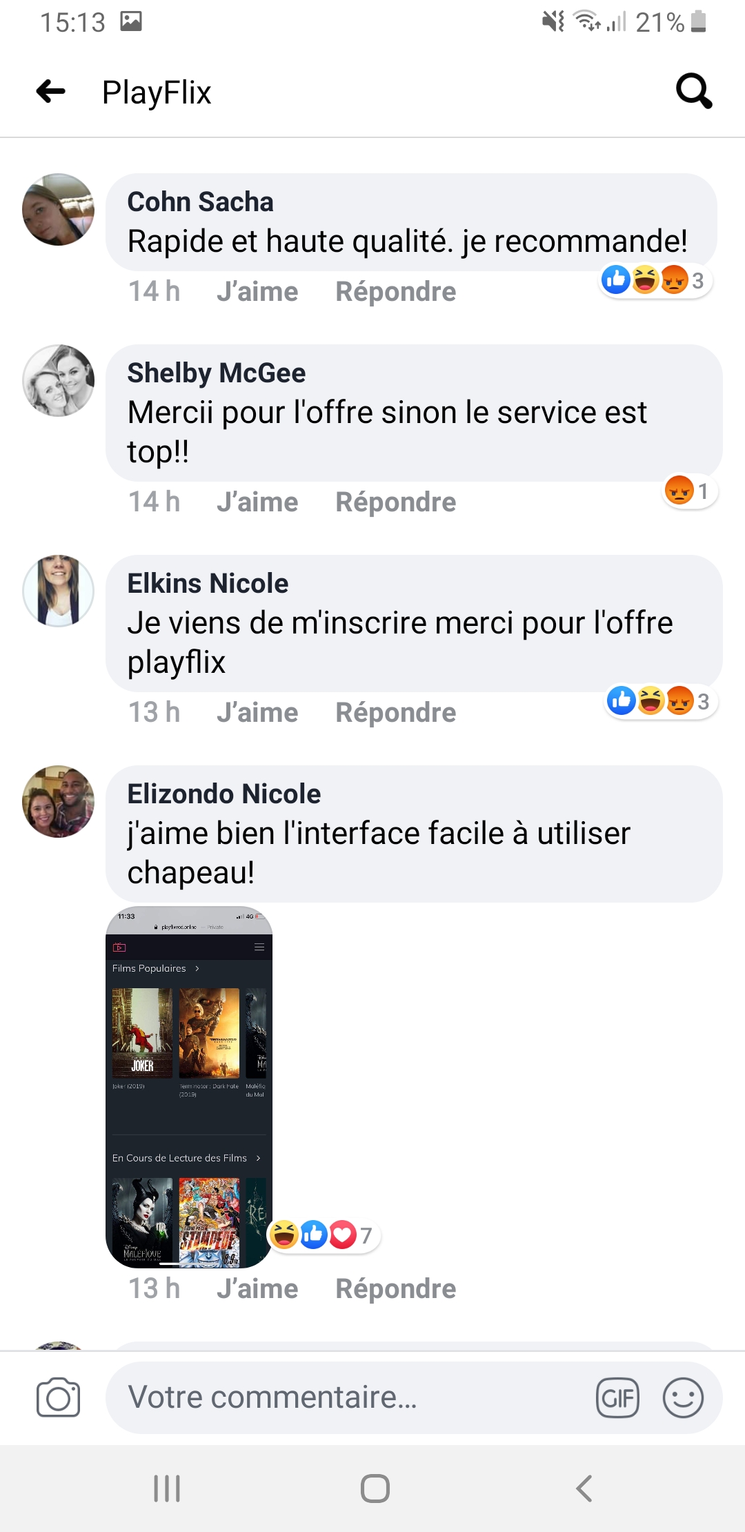 Sur Facebook, vous pouvez trouver une offre alléchante : un abonnement de 12 mois d’essai sur la plateforme Playflix (cc Netflix) qui permet de visionner tous les films actuellement en salle. Quand on voit cette offre bien trop grande et qu’on connait la législation française sur les films au cinéma, on sait d’ores et déjà que c’est une arnaque. Le problème est que l’information est sponsorisé et que les commentaires de la publication valorisent le contenu alors que ce sont des fake-compte en sommeil. En effet, il suffit de cliquer sur leur profil, et étrangement ils vivent tous à Rome et ont fait des études dans le monde entier. Pas malin les escrocs. Le pire, c’est que la manière dont sont écrits les commentaires n’est absolument pas naturelle. Sur le net, pas d’informations concernant cette plateforme. Donc c’est malveillant. Informez vos proches les moins méfiants puisqu’il paraît que certains sont débités par cet organisme et n’arrivent pas à s’en défaire.