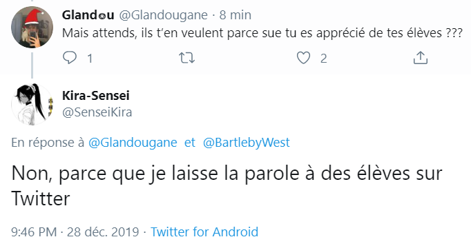 Article écrit à la légère mais avec sérieux (antithèse !!). Ce qui est important à comprendre à travers ce drama, c’est que ce qui est reproché à cette supposée enseignante, c’est de faire du bashing anti-prof dans un contexte où le métier d’enseignant est difficile et inconsidérée. De multiples précédents nous l’ont démontré. Ce qui est très dommageable, c’est cette tendance à ne parler que du négatif. Ô jamais personne n’a prétendu qu’un mauvais prof (notion hyper subjective) n’existait pas. Mais pourquoi parler du négatif une énième fois alors que les choses positives sont si peu émunérées alors que sûrement elles en sont la majorité et les plus belles ? Ce n’est qu’à la suite de ce reproche que Kira a fait un point tweet positif sur les profs.