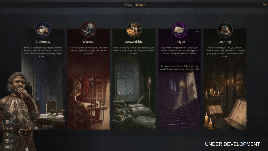 Les styles de vie de Crusader Kings III sont extrêmement différents de Crusader Kings II. Le système devient un arbre de compétences, comme dans les RPG. En acquérant de l’expérience, des compétences pourront être débloqués ce qui donnera des bonus à votre personnage. Il existe cinq catégories de style de vie (diplomatie, martial, intendance, intrigue, érudition). Chaque catégorie contient trois arbres de compétences. En choisissant une catégorie, le joueur a accès à un focus : un bonus immédiat qui sert surtout à l’utilité immédiate. Chaque focus amène des intrigues d’événement qui pourraient être positifs pour votre personnage ou votre royaume. Une fois l’arbre de compétence terminé (ce qui sera long), votre personnage obtiendra un trait très puissant (exemple : Maître Séducteur dans CKII). Votre personnage pourra en accumuler plusieurs. 15 caractéristiques sont liées aux arbres des modes de vie. D’autres peuvent être gagnées grâce à des événements spéciaux. Votre style de vie ne pourra être choisi qu’en tant qu’adulte. Cependant, l’éducation que vous recevrez en tant qu’enfant sera influente dans le sens où vous aurez une affinité avec tel ou tel style de vie. Selon un système de rang. Vos traits et vos caractéristiques auront une influence également sur le mode de vie. Une fois par vie, vous pouvez réinitialiser toutes les compétences pour un seul arbre de vie, ce qui vous donnera du stress. Le stress semble être un nouveau facteur du jeu, encore peu décrit.