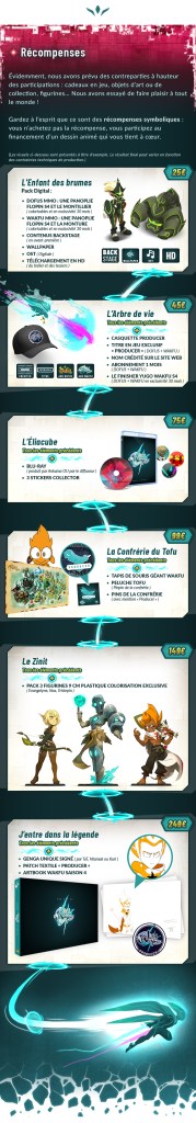 Un kickstarter fonctionne par palier. Une fois un palier atteint, un nombre d’épisode précis sera produit. Le premier palier est de 100 000 euros et garantissait le financement d’au moins trois épisodes. À partir de là, chaque nouveau palier atteint qui vaut 100 000 euros de plus garantit le financement d’un épisode supplémentaire. À l’heure actuelle, les 500 000 euros ont été atteint et sept épisodes de Wakfu saison 4 seront au moins produits. À partir d’un certain montant donné, le donneur pourra se voir octroyer une petite récompense pour le remercier.