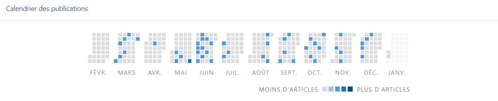 Alors que l’année 2019 avait connu un quasi doublement des articles (158 articles), l’année 2020 est revenue au rythme de la première année (64 articles). L’objectif d’un article tous les trois jours n’a pas été atteint, cela s’explique par les études chronophages que j’effectue. Effectivement, les mois de février, avril et mai sont totalement vides. Une période particulière où ma vie personnelle a été bouleversée et où je n’ai pu entretenir le blog en articles, en plus du fait que j’avais un mini-mémoire (consultable ici !) à rédiger. Mais le temps était bon à prendre, j’ai eu une excellente note. L’objectif est désormais est d’avoir une année au moins aussi productive, je ne peux promettre mieux étant donné que je prépare un concours, rendant les choses plutôt compliquées.