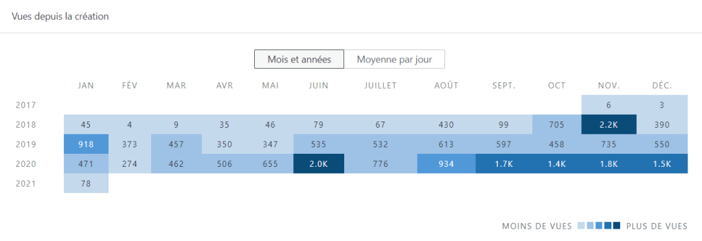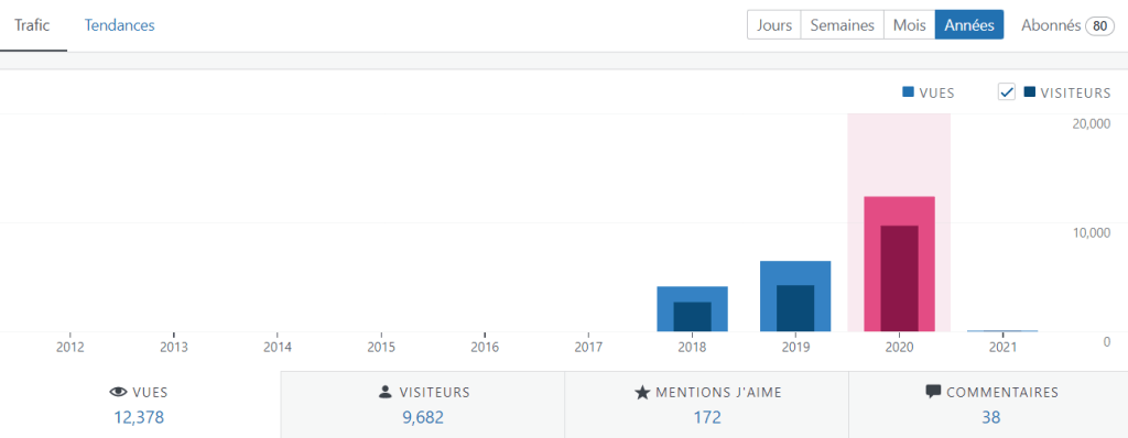 Alors que le blog avait connu une hausse de 56% de ses visites de l’an 2018 à 2019, cette fois-ci celui-ci a connu une progression de 91% (+5913 visites) avec un total de 12 378 visites ! Le ratio de vues/visites a légèrement diminué à 1.28 articles (contre 1.53), signe que la navigation sur le blog est davantage ponctuelle. Les nombres de « J’aime » atteint 172 likes, une baisse de plus de moitié et le nombre de commentaires s’élève à peine à 38. L’année 2019 était plus performante, cela est sans doute dû à cette année 2020 bien moins productive en nombre d’articles.