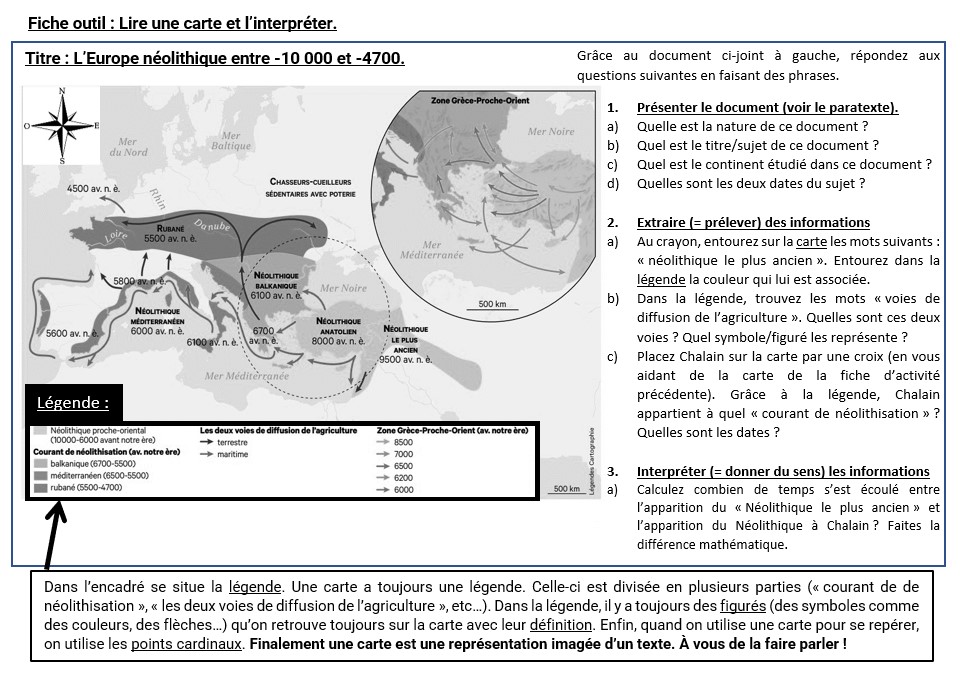 Le prélèvement des informations avait pour objectif de retrouver une information sur la carte, et de l’associer à son figuré dans la légende afin de faire le lien entre les deux parties : ici, c’était de trouver le foyer originel du Néolithique. Ensuite, il s’agissait de trouver comment l’agriculture était diffusée à travers l’Europe : les élèves devaient ainsi retrouver la bonne partie dans la légende, comprendre le figuré et sa définition. Enfin, les élèves devaient localiser Chalain sur la carte (la fiche d’activité précédente localisait le village sur une carte de France) par une croix, et identifier son courant de néolithisation. Ainsi, chaque partie était travaillée : retrouver une information sur la carte et sur la légende, puis replacer une information sur la carte.