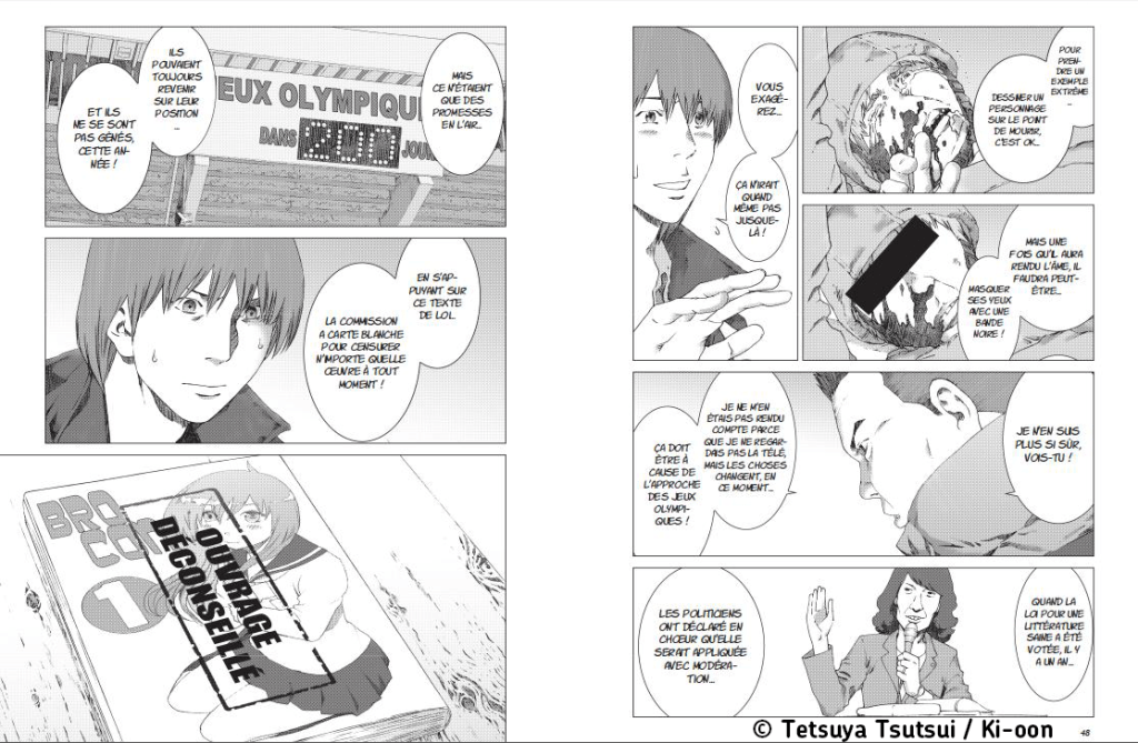 2019, les Jeux Olympiques arrivent à grand pas à Tokyo et le Japon se prépare à se dévoiler aux caméras du monde entier. Tentées de mettre en avant une société idéale, des organisations de purification se mettent en place. Tout à coup, des œuvres jugées nocives par un comité de censure ne sont autorisées à la vente qu’à partir d’un certain âge. Évidemment, ces règles rendent frileux les éditeurs, distributeurs et détaillants qui naturellement se refusent à mettre en rayon les œuvres censurées. Si l’histoire s’arrêtait là, nous pourrions comprendre. Nous suivons cependant Mikio, jeune apprenti mangaka qui souhaite se lancer avec son histoire Dark Walker. Celui-ci a trouvé un éditeur intéressé mais qui lui suggère correction après correction. Mikio a du mal à comprendre, son histoire ne montre que des hommes contaminés se dévorant entre eux : un peu de cannibalisme, du sang, un aspect un peu glauque, bref, des éléments vus et revus. Mais voilà que la censure s’intensifie et que Dark Walker malgré les corrections du jeune Mikio se retrouve dans le viseur du comité. Selon le comité, dessiner des aspects violents pourraient engendrer des comportements violents comme l’ont démontré plusieurs affaires médiatisées les années précédentes. Mikio acceptera-t-il de dénaturer son œuvre pour survivre financièrement ou ira-t-il jusqu’à se faire banlist pour sa liberté d’expression ?