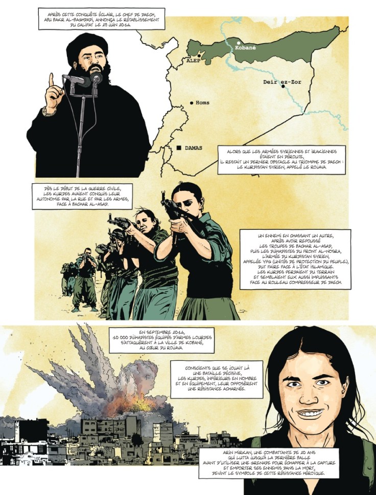 Jusqu’à Raqqa est une BD véritablement intéressante parce qu’elle permet d’en apprendre un peu plus sur les conflits au Proche-Orient. L’Irak et la Syrie sont des lieux dont on entend souvent les noms mais dont on connait peu la géopolitique. Les Kurdes sont un peuple qui nous touche, mais comment combattent-ils ? Au-delà des conditions de combat, on en apprends comment sont accueillis les étrangers qui forment leur rang, les difficultés de communication et de déplacement des différentes troupes. C’est aussi apprendre où se déroulent les combats, ici dans le nord de la Syrie, dans un territoire nommé Rojava. C’est vivre en témoignage la reprise de Raqqa, capitale des Kurdes en Syrie. Cette BD est un document d’histoire, un témoignage important et un document original.