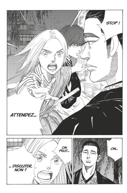 Le dernier chapitre de Blue Wolves nous a laissé sur un combat prêt à éclater. Un mystérieux inconnu pavé de viles intentions a croisé le chemin de Nio et Hajime. Du combat, de la démonstration de puissance et du sang coulent dans ce troisième tome qui consiste en une chasse aux assassins. C’est mon préféré. Au lieu d’être simplement une série d’action violente, Tsuyoshi Yasuda – au-delà de travailler sur le thème de la justice – nous offre une histoire plus réflexive. Nio est un gamin naïf mais plein de bonne volonté. Son arme n’est pas le sabre en bois qu’il porte mais son idéalisme et ses mots. Bien sûr, ça ne marche pas tout le temps, les situations provoquent alors sourire mais aussi réflexions pour le lecteur. Je me suis laissé transporter davantage par l’écriture que par l’action placée au second plan. On se plaît à admirer les Miburo pour leur travail de police car Nio donne du sens à la violence légitime qu’il monopolise. On se plaît à vivre dans un groupe dont l’honneur est la justice, la solidarité au milieu d’une ambiance malsaine de rejet. J’apprécie de plus en plus Blue Wolves par ce personnage plein d’empathie révélant un groupe fraternel plutôt que mafieux.