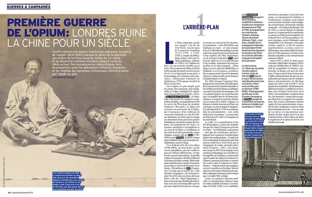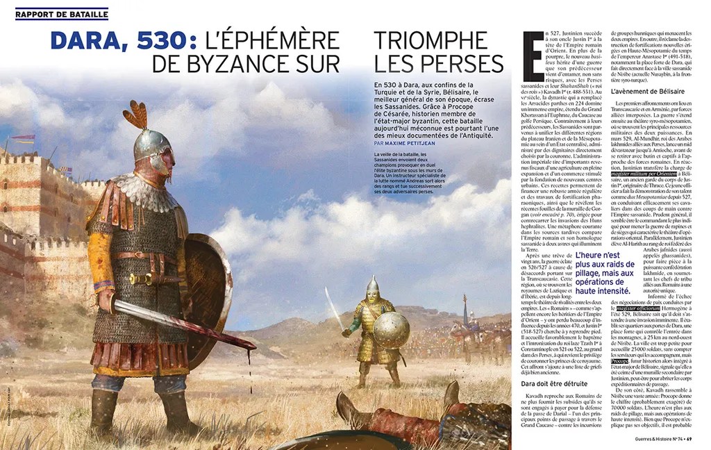 Vient de paraître le n°74 de Guerres & Histoire d’août 2023. Parmi les nombreux articles dans ce magazine dense, quelques articles s’intéressent aux affrontements face au Mongols, à la bataille de Dara en 530 menée par Bélisaire ou encore la 1e guerre de l’opium. (cf sommaire plus bas)