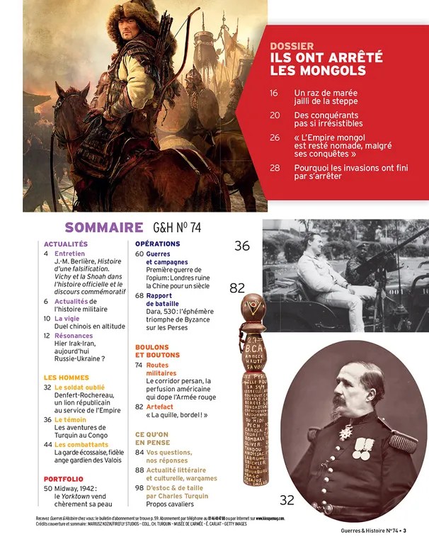 Le dossier principal sur l’expansion des conquêtes mongoles et les peuples les affrontant, est coécrit par Frédéric Bey, Marie Favereau et Antoine Reverchon. Ensuite, un rapport de bataille décrit la bataille de Dara en 530 où les Byzantins victorieux des Perses Sassanides sont menés par Bélisaire. Ou encore, un dossier sur la première guerre de l’opium (1839-1842) en Chine qui a marqué la « descente aux enfers » du pays envahi par les Britanniques.