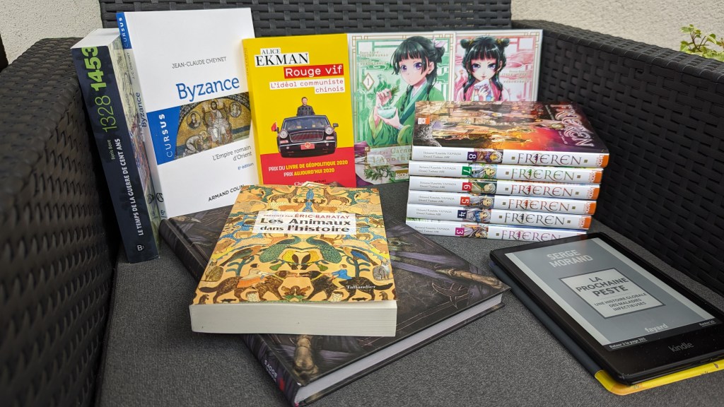 Cette semaine, je dois être à jour sur Frieren, à savoir les tomes 5 à 8. Ensuite, j’ai acheté une nouvelle série, Les Carnets de l’apothicaire. J’ai échoué à avoir le temps de lire Diablo : Le livre d’Adria, il va falloir que je m’y mette. De même, pour le travail, je vais devoir reprendre Le temps de la Guerre de Cent Ans par Boris Bove ou Byzance de Jean-Claude Cheynet…