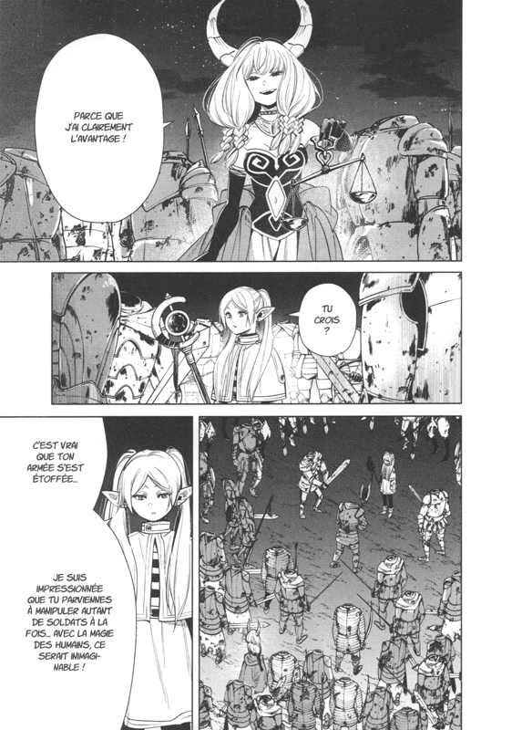 Frieren, Fern et Stark sont arrivés à la ville-citadelle de Waal dans leur périple de rejoindre l’ancienne forteresse du roi-Démon pour parler avec les morts. Curieusement des démons ont été invités par les dirigeants de la ville pour parlementer. Une diplomatie qui ne plaît pas à Frieren qui sent un coup monté. Évidemment, ça l’était et les hostilités ont commencé entre nos trois compagnons et les quatre démons. Le tome 3 de Frieren reprend directement avec Fern et Stark qui ont sauvé le maire, et Frieren qui s’est présenté devant Aurore, une ancienne grande mage du roi-Démon.