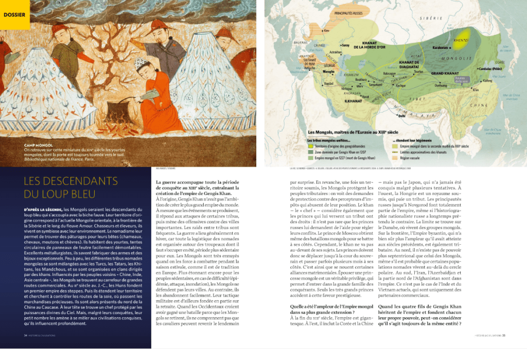 Le dossier principal du numéro s’intéresse à l’empire mongol dont l’historiographie est renouvelée grâce et par l’historienne Marie Favereau. Son ouvrage La Horde : Comment les Mongols ont changé le monde a été récompensé par le Grand Prix des Rendez-vous de l’histoire à Blois en 2023. À Nantes, une exposition sur Gengis Khan sera visitable dès 2024. Au-delà du dossier, le podcast Storiavoce a consacré 3 numéros d’interview avec l’historienne. Le dossier dont le cœur est un entretien revient sur tous les aspects de la vie sociale, économique, culturelle, religieuse et politique du peuple mongol dont l’empire vit de la fin du XIIIe au début du XVe siècle. Marie Favereau répond aussi aux questions sur nos représentations européennes du peuple mongol. Les conquêtes militaires, les relations vis-à-vis des peuples soumis et l’extension du territoire sont mis en avant, sans oublier la place des femmes ou de leur nomadisme. Du dossier et de l’entretien en podcast, je retiens de nombreuses idées à contrecourant de ce qu’on pensait auparavant sur ce peuple. D’abord, les Mongols ne se sont pas sédentarisés : leur culture nomade est restée essentielle pour eux. Bien qu’ils pussent se convertir à certaines religions, ils consacrèrent surtout leur piété à leurs valeurs traditionnelles et à leur animisme. Dans un empire aussi grand, les populations sont diverses et à l’opposé d’autres empires, les Mongols n’ont pas cherché à imposer leurs idées mais plutôt à accepter que cohabitent la diversité tant qu’elle respectait les règles de l’empire. Ces règles sont surtout économiques : Marie Favereau appelle le « Grand échange mongol » comme le système et le circuit économique qui fait de l’empire un territoire riche et puissant, forme d’une première mondialisation. Enfin, on retient que les Mongols ne cherchaient pas à détruire villes et villages mais à user de diplomatie parce que les sédentaires fabriquent et échangent des produits. En bref, l’empire mongol est un vaste territoire d’échanges de savoir et d’échanges économiques. Un article de Gabriel Martinez-Gros suit sur l’islamisation de certains chefs, et un dernier s’ensuit sur la mémoire chinoise face à son passé mongol, pays qui a d’ailleurs fait retarder l’exposition à Nantes, les chercheurs refusant la censure que voulait imposer la Chine sur leurs recherches.