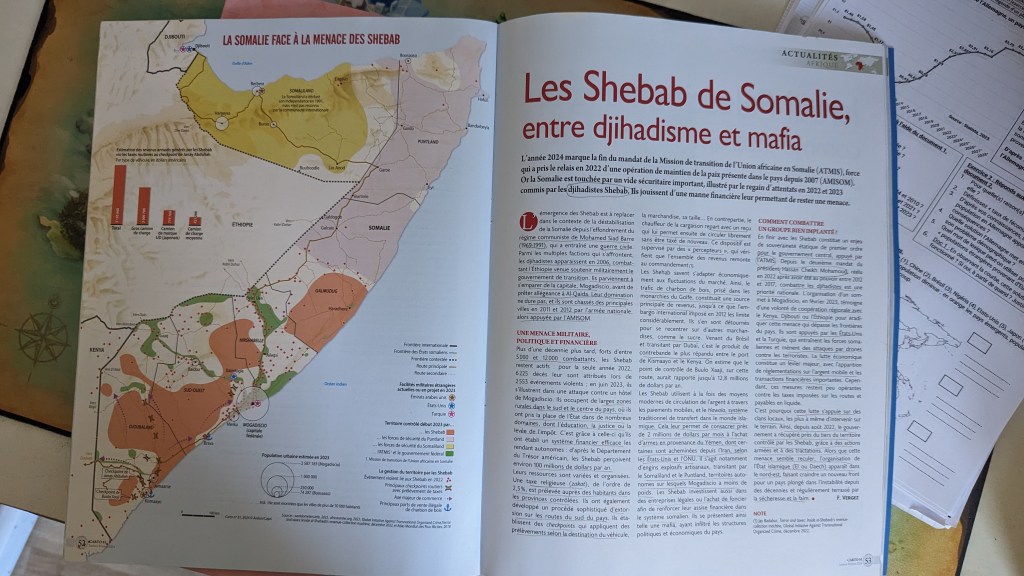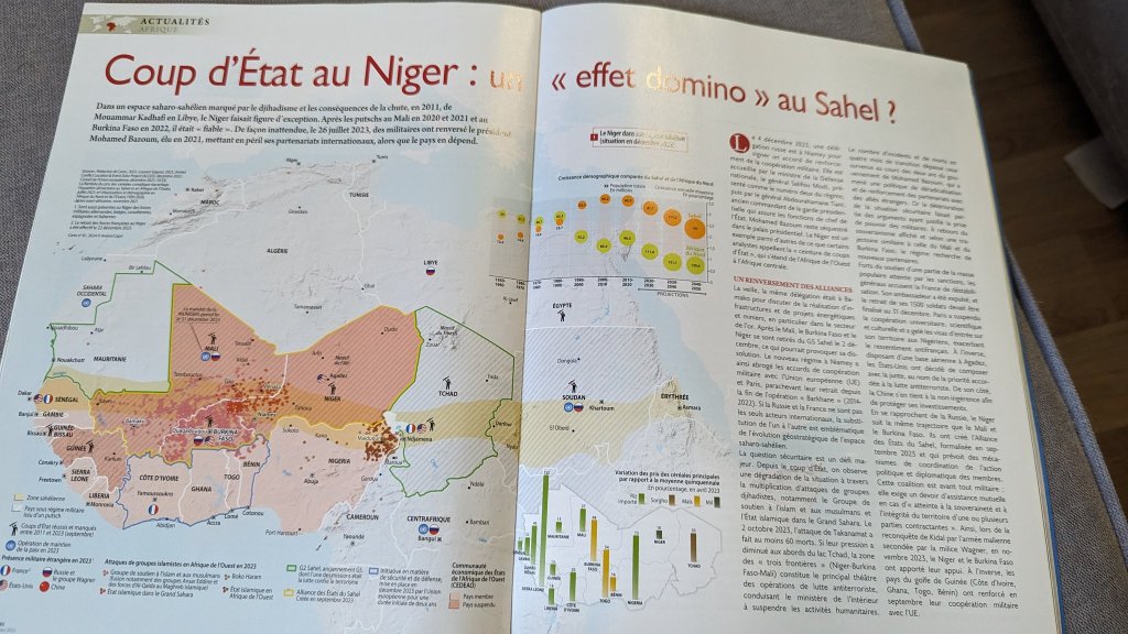 Parmi les articles d’actualité, j’ai particulièrement apprécié les pages sur le Niger et la Somalie. Le Niger est un pays d’Afrique qui a subi un coup d’État de la part des militaires, à la suite du Mali et du Burkina Faso. La junte militaire change de stratégie : dénonçant le partenariat français et les conventions minières des entreprises françaises, le Niger se tourne vers d’autres États dont la Russie dans l’objectif, dit-il, de mieux se défendre contre les djihadistes. C’est tout le contraire qui se produit, jamais la population ne fut autant attaquée ces dernières années depuis le pustch.