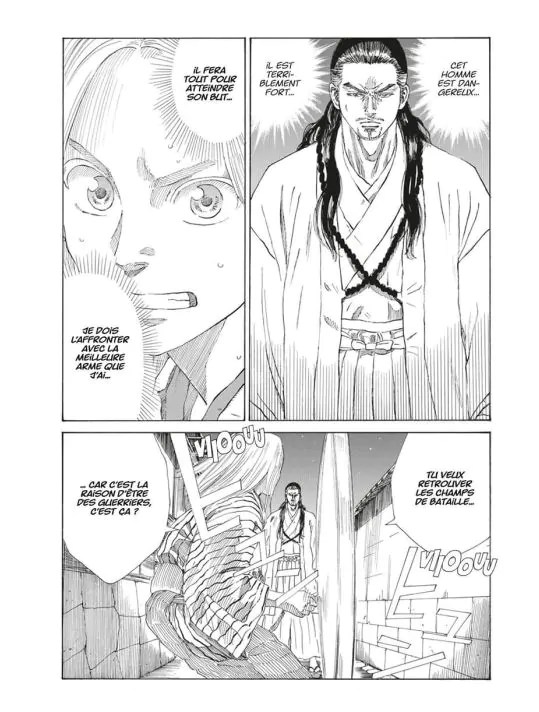 Alors que Nio a fui avec le shôgun pour le protéger de quelques assassins, un samourai, Naomizu, les retrouve. « Qu’est-ce que la bravoure ? » : cette question que le samourai pose à ses adversaires va traverser le tome 5 de Blue Wolves. Dans la quête de Nio pour défendre la veuve et l’orphelin, cette interrogation est pertinente parce que sa réponse puise dans notre propre subjectivité. Pour Naomizu, la bravoure doit sûrement être le courage de faire couler le sang jusqu’à la mort. Pour Hijikata, membre du clan des Miburo, ce mot ne veut rien dire – mais le récit de sa vie laisse à penser qu’il s’agirait peut-être de braver les conditions de sa naissance pour réussir. Hijikata est fils de fermiers, il est désormais un combattant hors-pair, ce qui aurait été normalement impossible pour lui. La bravoure pour lui est peut-être la foi de remercier tous ceux qui l’ont aidé jusqu’à présent – lui qui n’est pas motivé par l’argent. Pour Hajime, la bravoure est la recherche de la force.