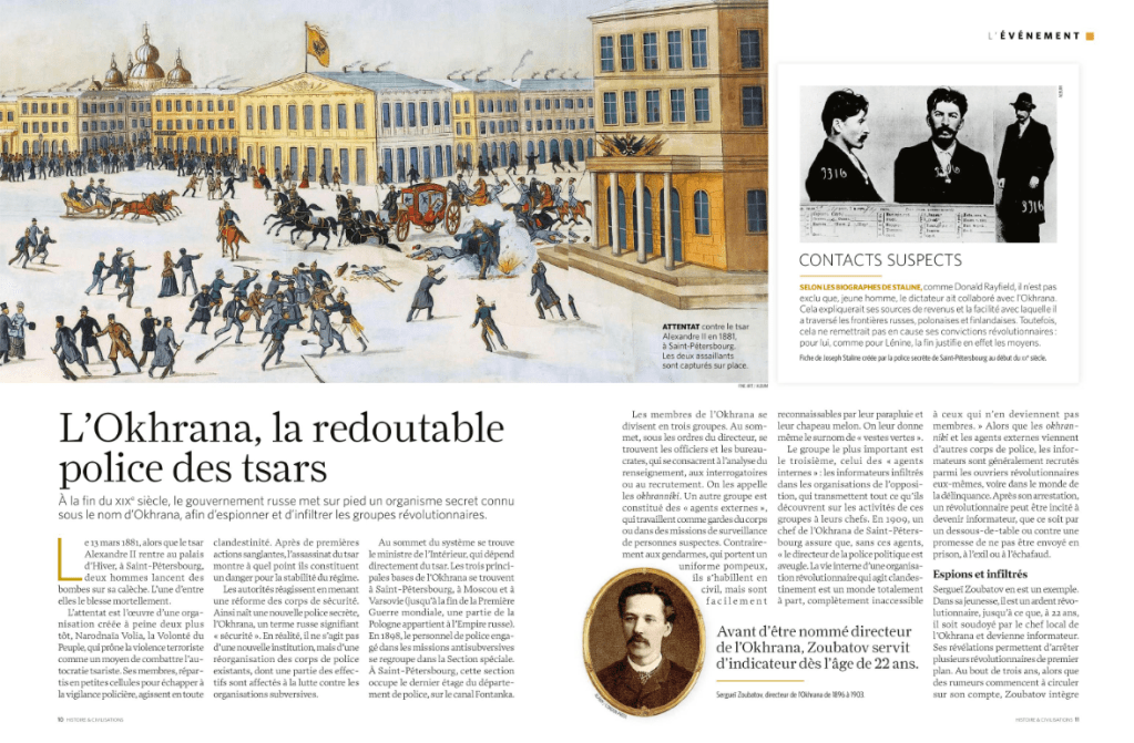 Un article d’Alfonso Lopez revient sur l’Okhrana, la police secrète des tsars en Russie. Elle est effectivement née à la fin du XIXe siècle d’une réorganisation des corps de police après l’assassinat du tsar Alexandre II le 13 mars 1881 par l’organisation Narodnaïa Volia (Volonté du Peuple) qui prône la violence terroriste comme un moyen de combattre l’autocratie tsariste. L’Okhrana fonctionnait grâce un directeur, des officiers et bureaucrates qui faisaient de l’analyse du renseignement, du fichage, des interrogatoires, du recrutement. Il y avait aussi des agents externes qui étaient gardes du corps ou faisaient des missions de surveillance. Enfin, il y avait les plus nombreux, les yeux : les infiltrés qui sont surtout recrutés chez les ouvriers eux-mêmes ou les délinquants. L’auteur nous cite par exemple Sergueï Zoubatov, révolutionnaire qui est soudoyé à 22 ans par un chef local de l’Okhrana et devient informateur. Ses renseignements lui font gravir les échelons au point de devenir directeur. Les partis révolutionnaires ouvriers étaient les plus surveillés, dont celui de Lénine où Roman Malinovski, ouvrier métallurgiste avec un casier judiciaire, devient le porte-parole du groupe bolchevik à la Douma (parlement impérial). Après la victoire de la révolution en 1918, le nouveau gouvernement supprime l’Okhrana mais une nouvelle police secrète plus violence vient de naître : la Tcheka, qui deviendra par la suite le NKVD, puis le KGB.