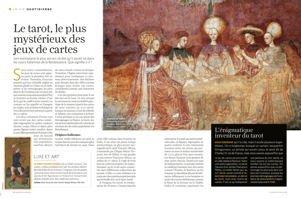 Pedro Ortega Ventureira signe un article sur le tarot et le mystère de ses origines. D’abord, il revient sur l’origine des jeux de carte, sans doute provenant de l’Orient (Inde ou Chine) mais dont les premières traces furent trouvées au Proche-Orient, puis les jeux sont arrivés en Europe à partir du XIVe siècle. Ces cartes, principalement numérales regroupées en quatre couleurs (denier, coupe, bâton, épée), et quatre figures (valet, cavalier, dame, roi) permettent de jouer à des jeux de hasard. Vite populaires, ces jeux sont interdits par l’Eglise et brûlés dans des bûchers, les cartes sont considérées comme une invention du diable. Le tarot n’est pas de la cartomancie à l’origine : cette pratique de la voyance ne remonte qu’au XVIIIe siècle. Le tarot est né lors de la Renaissance, probablement en Italie où nous disposons de jeux différents. Le tarot Visconti-Sforza commandé par le duc de Milan au milieu du XVe siècle avec trois jeux de carte incomplets, peints à la main dans des matériaux précieux. Il y a le tarot de Mantegna dans la région vénitienne vers 1465-1470 qui est très différent où le jeu compte des cartes de la condition humaine et des vertus du christianisme : le but est d’arriver à la plus haute condition humaine, au sommet de l’échelon, occupé par le Pape. Enfin, le tarot Sola-Busca dans lequel figurent sur les cares des personnages et leur nom (Alexandre le Gand, Caton, la déesse Pallas Athéna), peut-être est-ce là un jeu didactique pour se familiariser avec les personnages de la Bible, la mythologie, l’histoire, la littérature. Pourquoi le tarot n’a-t-il pas été condamné par l’Église ? A la différence des jeux populaires, le tarot inclut des cartes « atouts », et dedans figurent des vertus chrétiennes. Quoi qu’il en soit, le tarot des origines est un jeu aristocratique, intellectuel et éducatif.