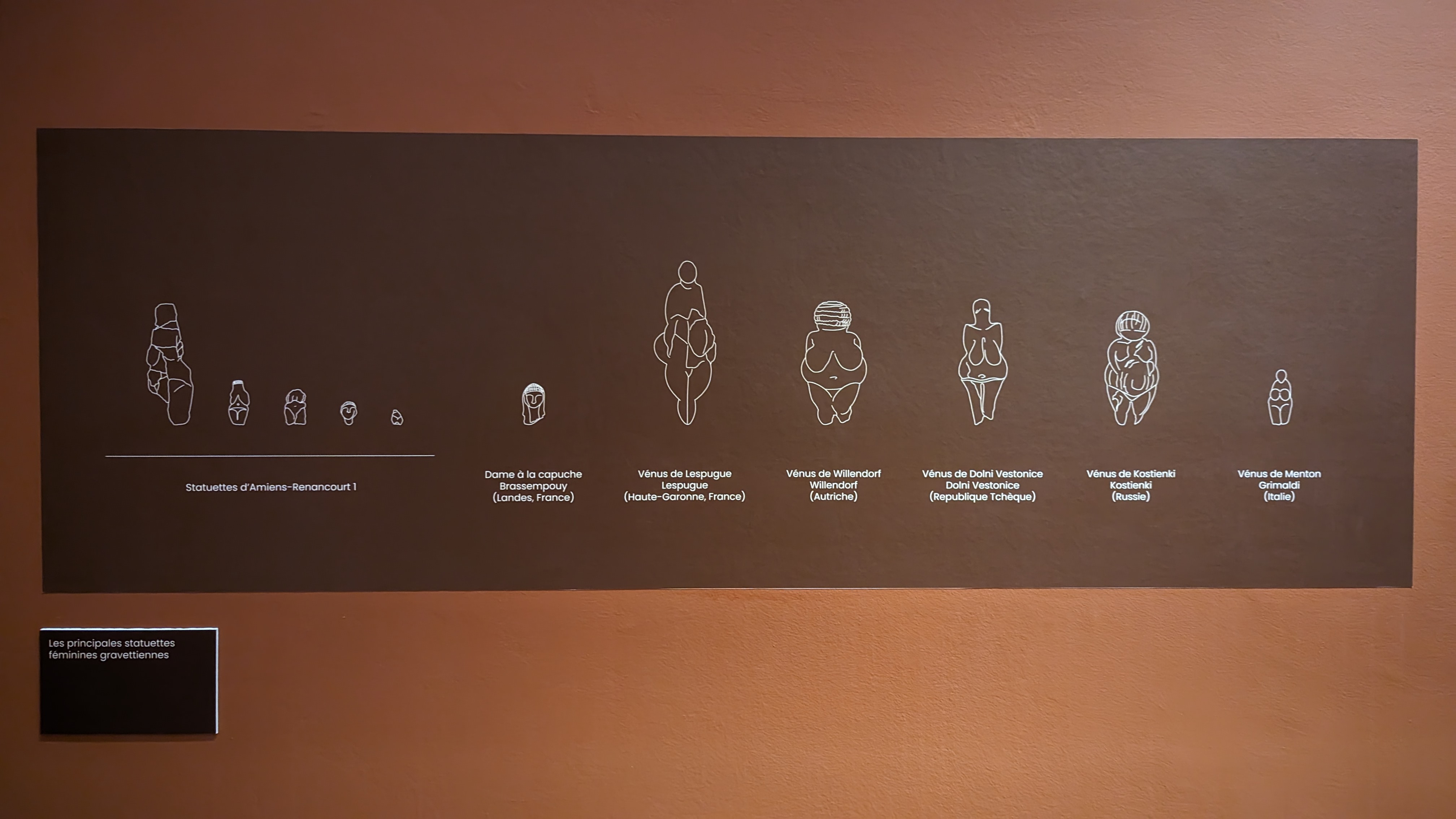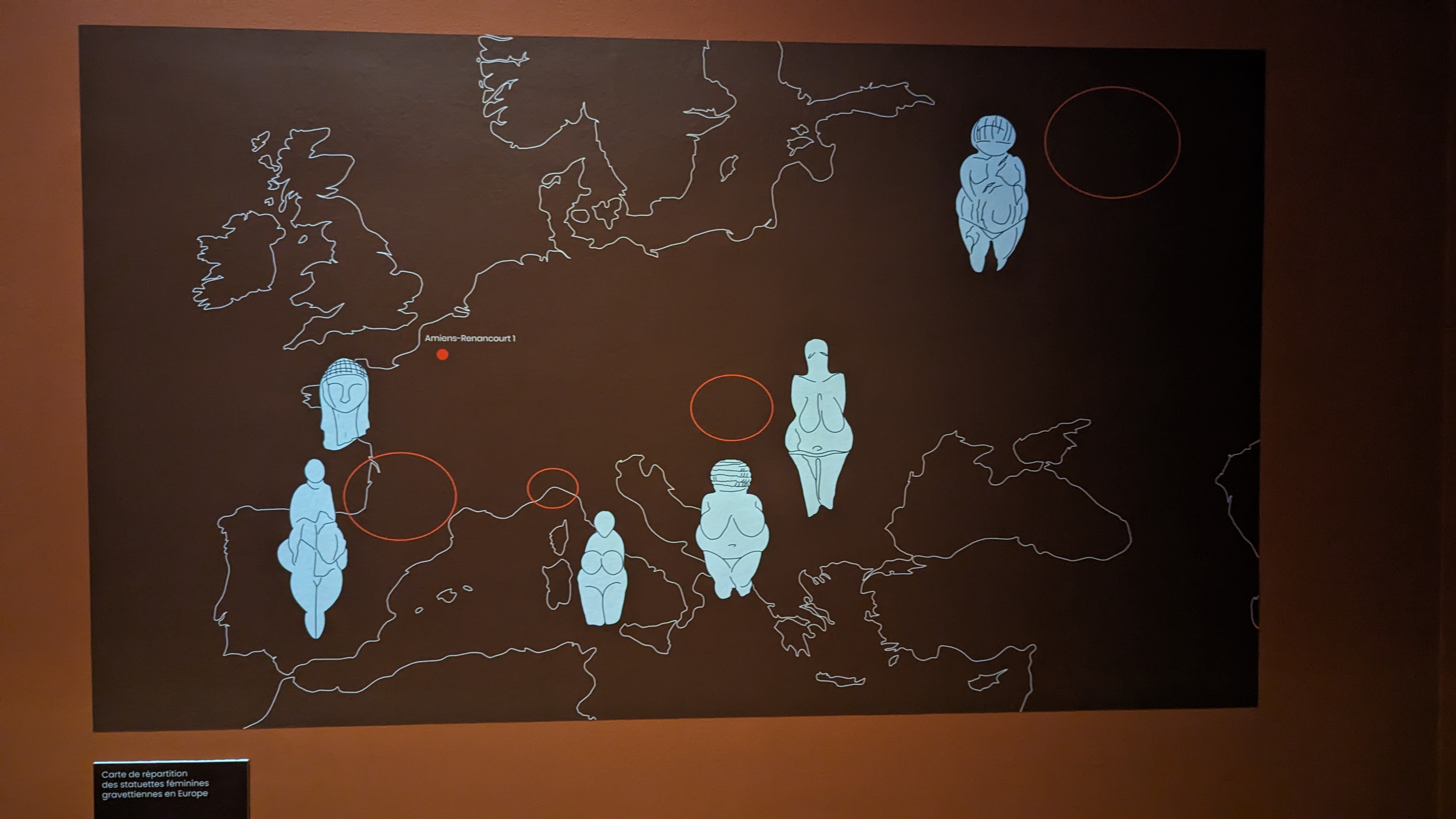 Enfin, la petite salle d’exposition présente un chef d’œuvre de la Préhistoire : les Vénus préhistoriques. Ce sont de petites silhouettes représentant un corps féminin retrouvées de la Sibérie jusqu’en France dont une à Amiens Renancourt. Élément intrigant et intéressant : comment une forme sculpturale a pu se répandre sur une aire spatiale aussi grande ? Agréable et instructive discussion avec notre expert préhistorien. Celui-ci décrit d’abord le silhouettes, sauf à quelques exceptions près, elles représentent la femme de la poitrine jusqu’aux mi-cuisses. Elles ont rarement des bras complets, très rarement des mains avec des doigts. Elles sont toujours de taille minuscule. Très probablement que la technique de diffusion s’est répandue par la transmission lorsque des membres de clan se dispersaient dans d’autres territoires ou quand il y avait des échanges d’individus. Selon le préhistorien, ces silhouettes représenteraient peut-être des femmes enceintes et seraient un outil de croyance avec l’espoir que l’accouchement se déroule bien. En effet, rappelle-t-il, notre espèce humaine a des accouchements très difficiles pour les femmes, où notre crâne est si gros qu’il peine à sortir (alors même qu’il y a un retournement du fœtus durant l’accouchement !) et que certains accouchements ont de graves conséquences sur la santé de la mère débouchant potentiellement sur sa mort.