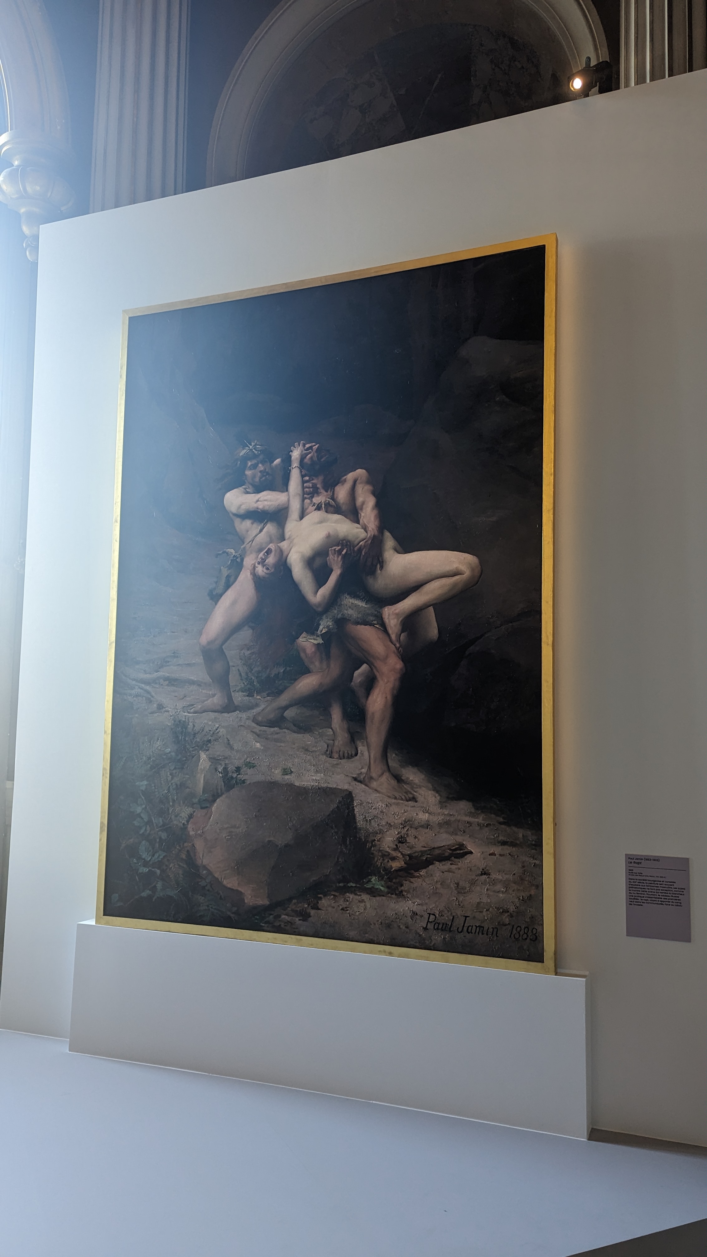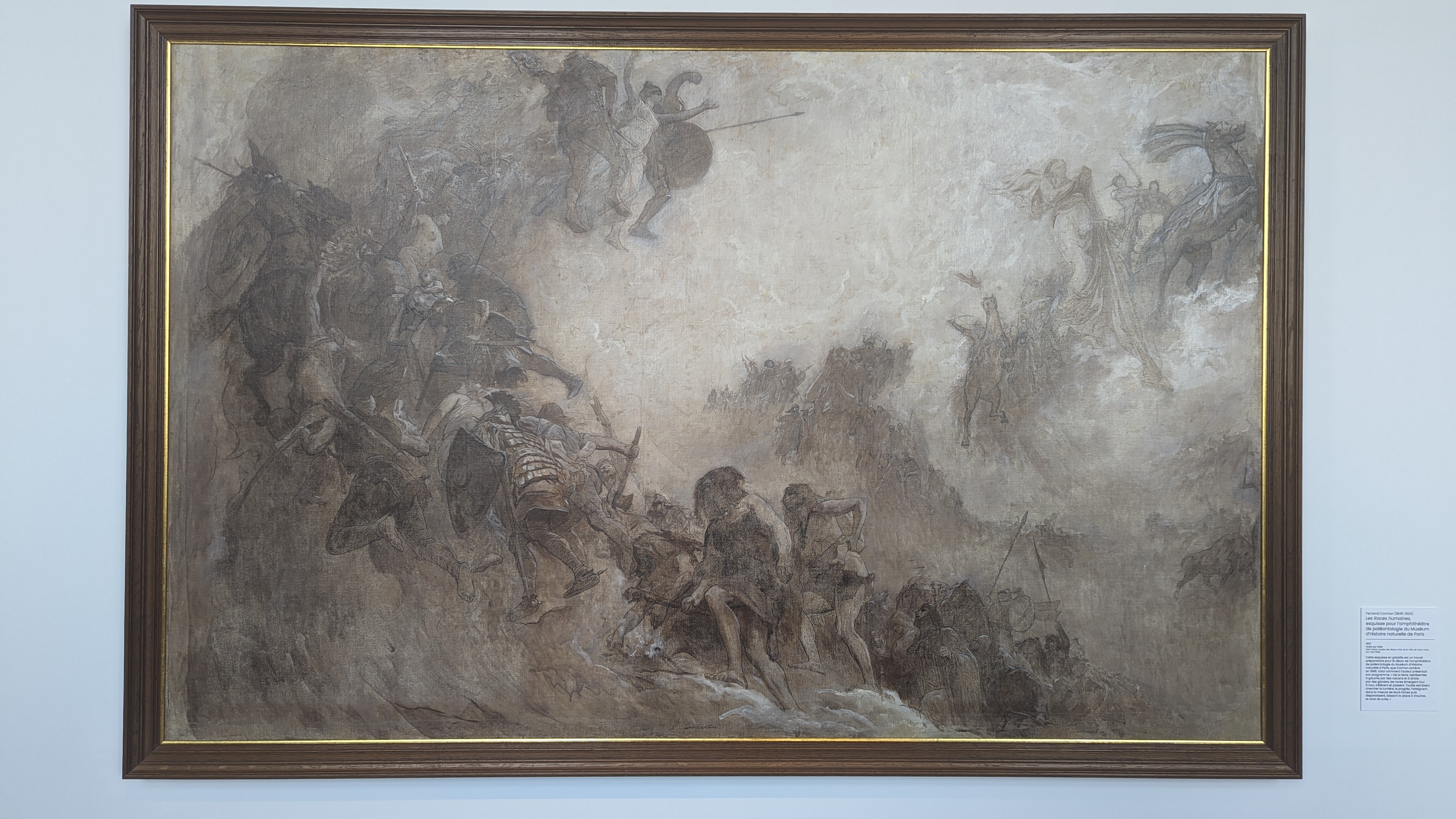 Alors notre guide nous détaille les peintures exposées d’un grand (mais petit par rapport aux autres espèces) mammouth laineux. Comment les Hommes du XIXe siècle se sont représentés les familles préhistoriques et leur environnement ? Le choix des peintures par les exposants est intéressant. Léon-Maxime Faivre à travers les Deux mères met en scène justement deux mères, une humaine, l’autre ourse, qui défendent leurs petits à l’orée d’une grotte. Rappelons utilement que les humains n’ont jamais vécu dans les grottes, mais uniquement devant – si ce ne sont leurs peintures qui sont à l’intérieur pour on ne sait encore trop quelle raison de venir les peindre dans des lieux si difficiles d’accès. Le tableau Le Rapt de Paul Jamin illustre ici l’enlèvement d’une femme sans doute par une autre tribu. Ces tableaux nous permettent de comprendre ce que pensaient les Hommes du XIXe siècle de la Préhistoire : que c’est une période dangereuse où les humains doivent survivre à divers prédateurs (l’ours, le loup). Or, en réalité, les humains dominaient déjà totalement l’écosystème. Pour ceux du XIXe siècle, les Hommes sont aussi sauvages : ils sont nus ou enlèvent des femmes. La nudité ici représentée est un classique de l’époque, qui sert aussi aux spectateurs de se… rincer l’œil. Cette représentation s’observe aussi sur le tableau Une famille de l’âge de pierre d’Emmanuel Benner. Ce qui est intéressant également, c’est l’artiste Fernand Common qui représente sur son esquisse Les Races humaines l’émergence des différentes races tour par tour, qui s’élancent en montant vers la lumière, le progrès. On y observe dans cette deuxième moitié du XIXe siècle l’inclusion des Hommes préhistoriques. Ca y est : les humains ont une nouvelle origine.