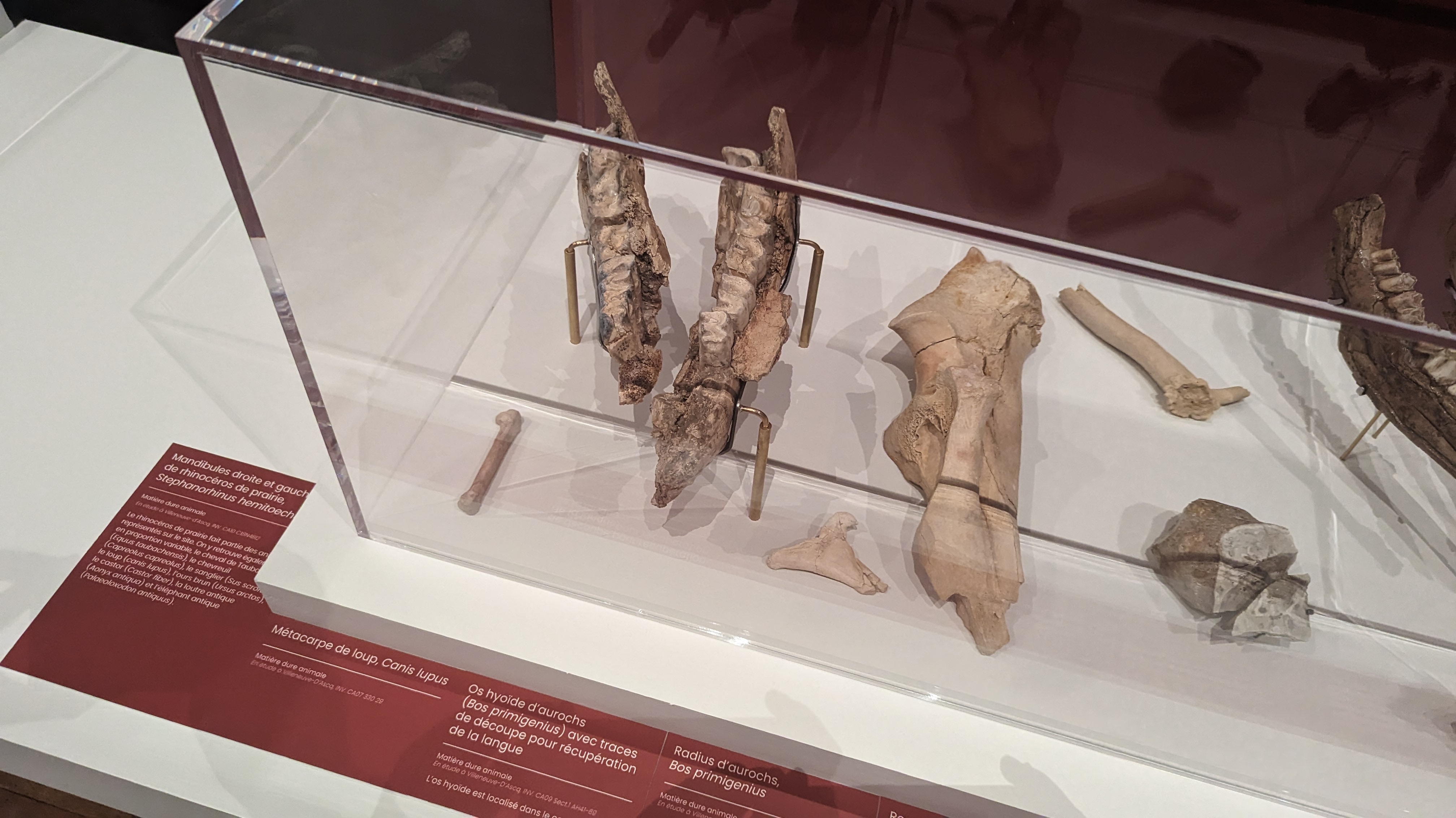 Tout au long d’un mur de la salle d’exposition, de nombreuses trouvailles archéologiques avec des crânes de différentes espèces humaines, des mandibules de rhinocéros de prairie, une métacarpe de loup, un radius d’aurochs ou encore son tibia ou son humérus, une mandibule de mammouth laineux. Ou des outils utilisés par les humains comme une grande lame, un nucléus… Au centre de la salle, un cortège du Mésolithique : l’objectif était de présenter la faune (il manque la flore) de cette période préhistorique qui fait la transition entre le Paléolithique supérieur et le Néolithique. Des animaux naturalisés (ou empaillés) et d’autres en silhouette permettent de se représenter les animaux qui vivant à l’époque ainsi que leur taille (parfois démesurée !).