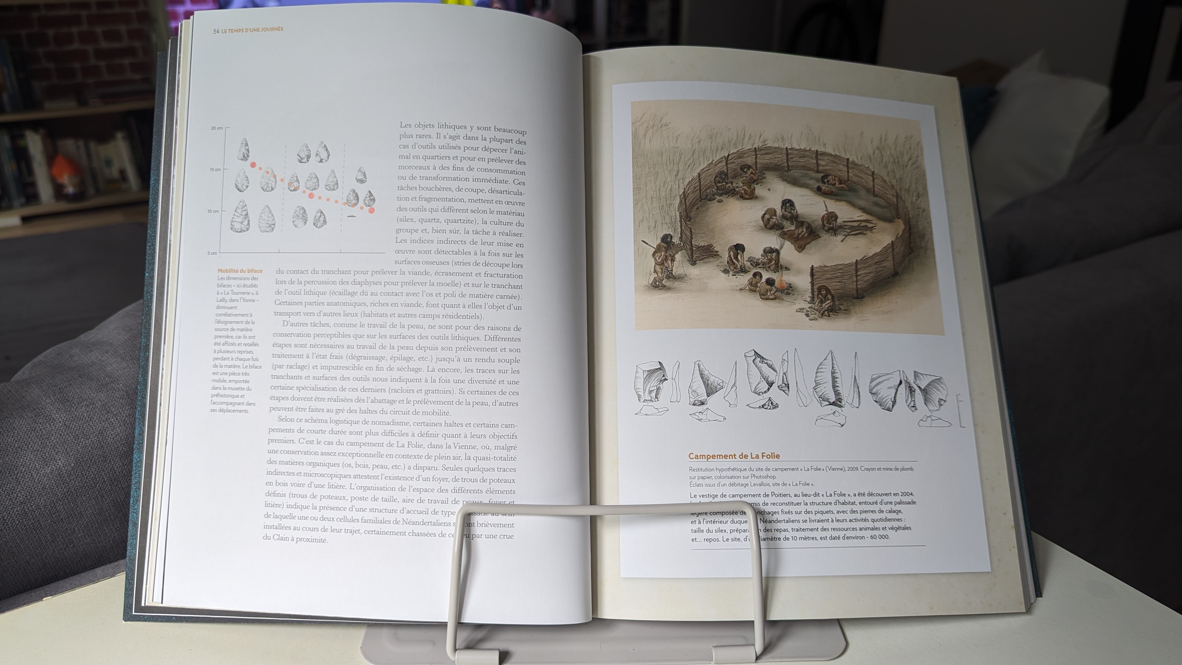 Au-delà de l’historiographie, l’ouvrage s’attelle à nous apprendre dans quel cadre vivait Néandertal. Rappelons qu’il était chasseur-cueilleur et nomade dans un monde où les phases glaciaires (qui durent 100 000 ans) et les phases interglaciaires (qui durent 10 000) s’alternaient, offrant un paysage de steppe digne de la Sibérie pour les premières, et un paysage de forêt tempérée pour les secondes. Néandertal était un chasseur qui ne mangeait pas que de la viande, il avait un régime très carné mais un régime omnivore. Il savait cuire la viande, manger des légumes, pêcher et se nourrir de fruits de mer. Il faisait aussi de la chasse opportuniste, était charognard. Néandertal était un chasseur spécialisé. Outre les campements, il avait des haltes de chasse ou des lieux de boucherie dans lesquels il découpait la viande, broyait les ossements, tailler des outils. Les archéologues ont retrouvé des trous alignés dans les campements, montrant que certains étaient entourés de palissades, habitant dans des huttes ou des cabanes en bois, voire des constructions utilisant des ossements. Comme ses prédécesseurs, il savait tailler le bois et la pierre. La culture matérielle de Néandertal se nomme le Moustérien (entre 250 000 à 30 000) avec des techniques de plus en plus complexes d’outillage. La profonde innovation de Néandertal est qu’il s’intéresse davantage aux éclats plutôt qu’au nucléus lui-même. Il savait donc utiliser le bois, la pierre, les os pour son mode de vie. Les campements de Néandertal étaient variés : bords de rivières, de lacs, en abri rocheux. Il a même su s’approprier le monde souterrain : il y a 176 000 ans, Néandertal a parcouru 330 m dans la grotte de Bruniquel (Tarn-et-Garonne) dans la totale obscurité et y a réalisé pour d’obscurs motifs d’étonnantes constructions composées de plus de 400 fragments de stalagmites.