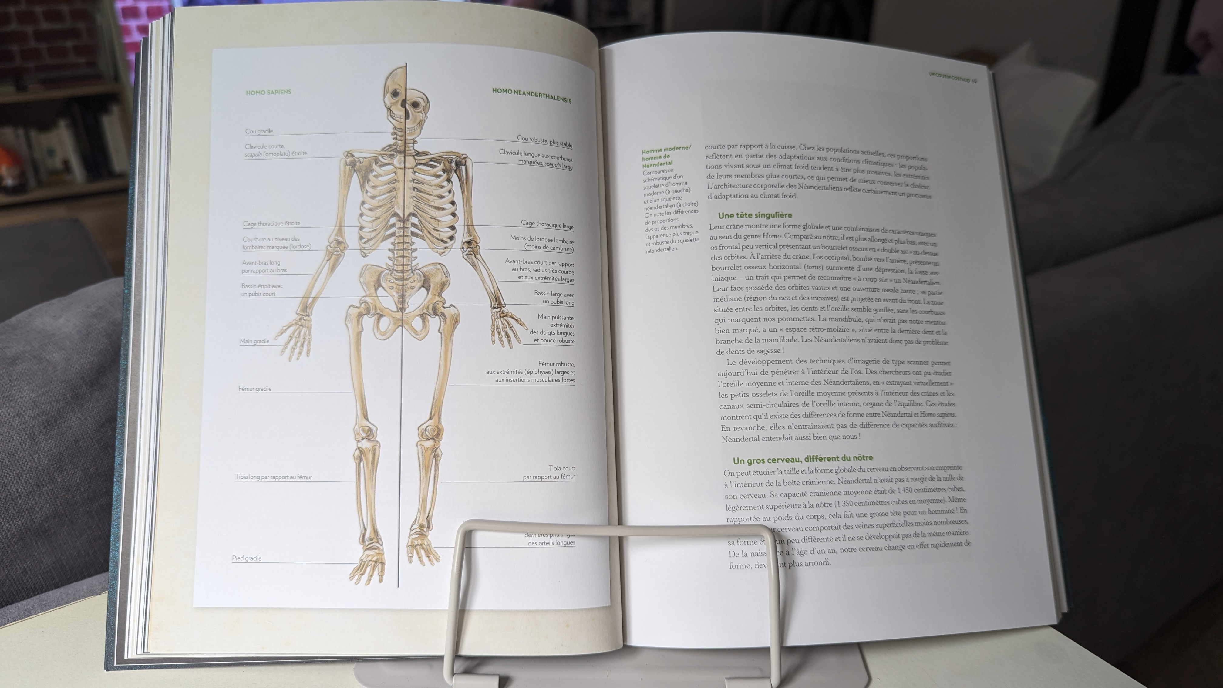 Néandertal est une espèce du genre Homo qui a cohabité en même temps que Sapiens en Eurasie. L’espèce semble émerger vers 350 000 ans, descendante d’Homo heidelbergensis, pour s’éteindre vers 40 000 ans. Les hypothèses dressées pour établir la lignée évolutive et la disparition de Néandertal apparaissent dans le livre Néandertal. C’est le géologue William King (1809-1886) qui a découvert que les ossements retrouvés en 1856 dans la vallée de Néander en Allemagne était une autre espèce que l’Homo sapiens. La première fois que nous avons identifié une nouvelle espèce du genre humain – même si des ossements de Néandertal ont été récupérés bien auparavant en 1848 à Gibraltar et en 1829 à Belgique. L’arrivée en France des travaux de Lamarck et de Charles Darwin avait fait prendre conscience que les populations humaines ne sont pas biologiquement et culturellement immuables et fixes dans le temps. L’anthropologie et l’archéologie deviennent évolutionnistes. Ainsi, l’objectif des fouilles devient aussi celui d’apporter des ossements fossiles qui permettront de « remonter le fil anatomique et typologique du temps ». Ses caractéristiques physiques sont différentes : le volume cérébral est presque identique au nôtre. Son crâne est plus étiré vers l’arrière, le thorax est plus développé, le système respiratoire plus adapté au froid. Il devait consommer 6000 calories par jour. Les femmes mesuraient 1m60 et pesaient 50 kg, les hommes mesuraient 1m70 et pesaient 75 kg, en moyenne.